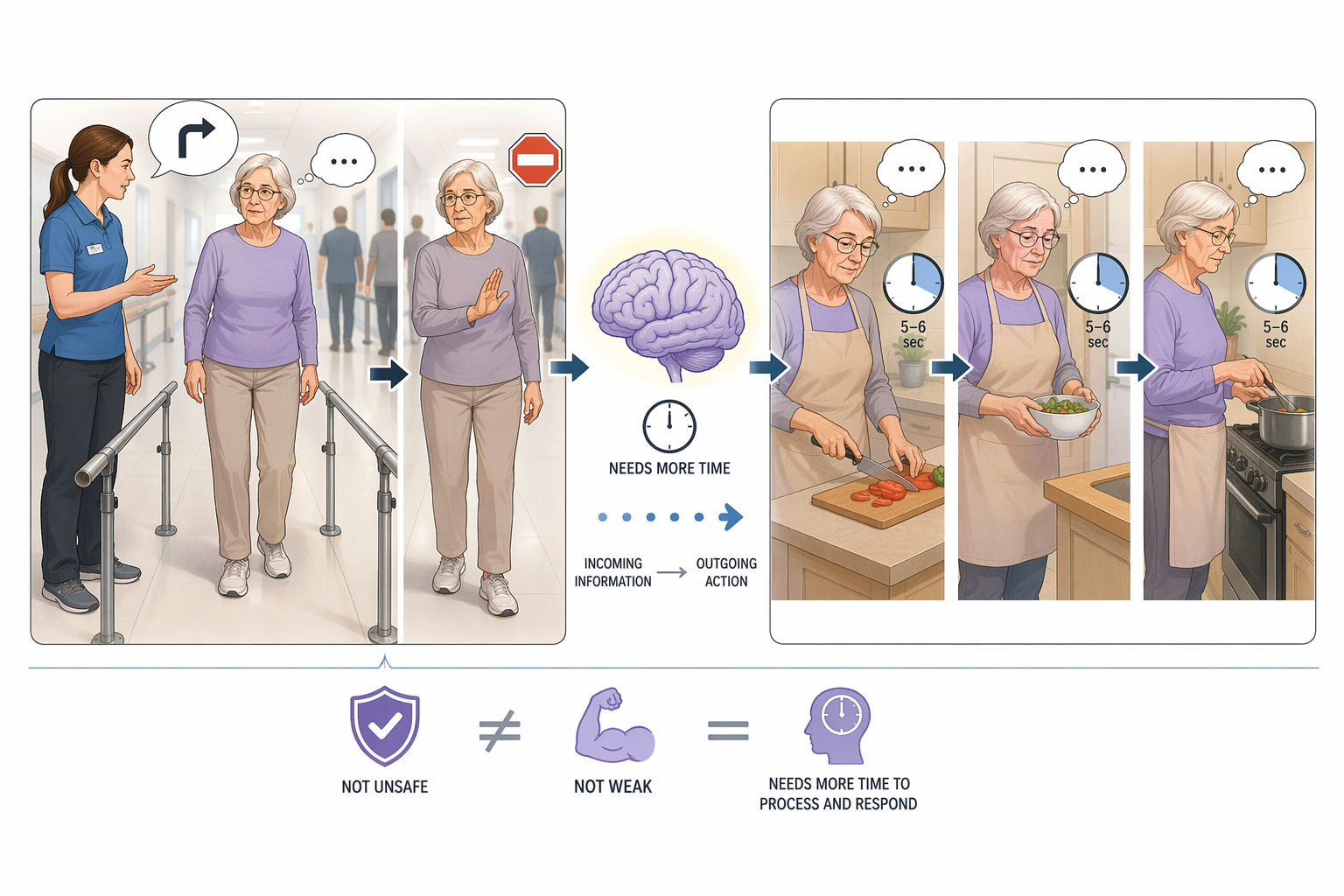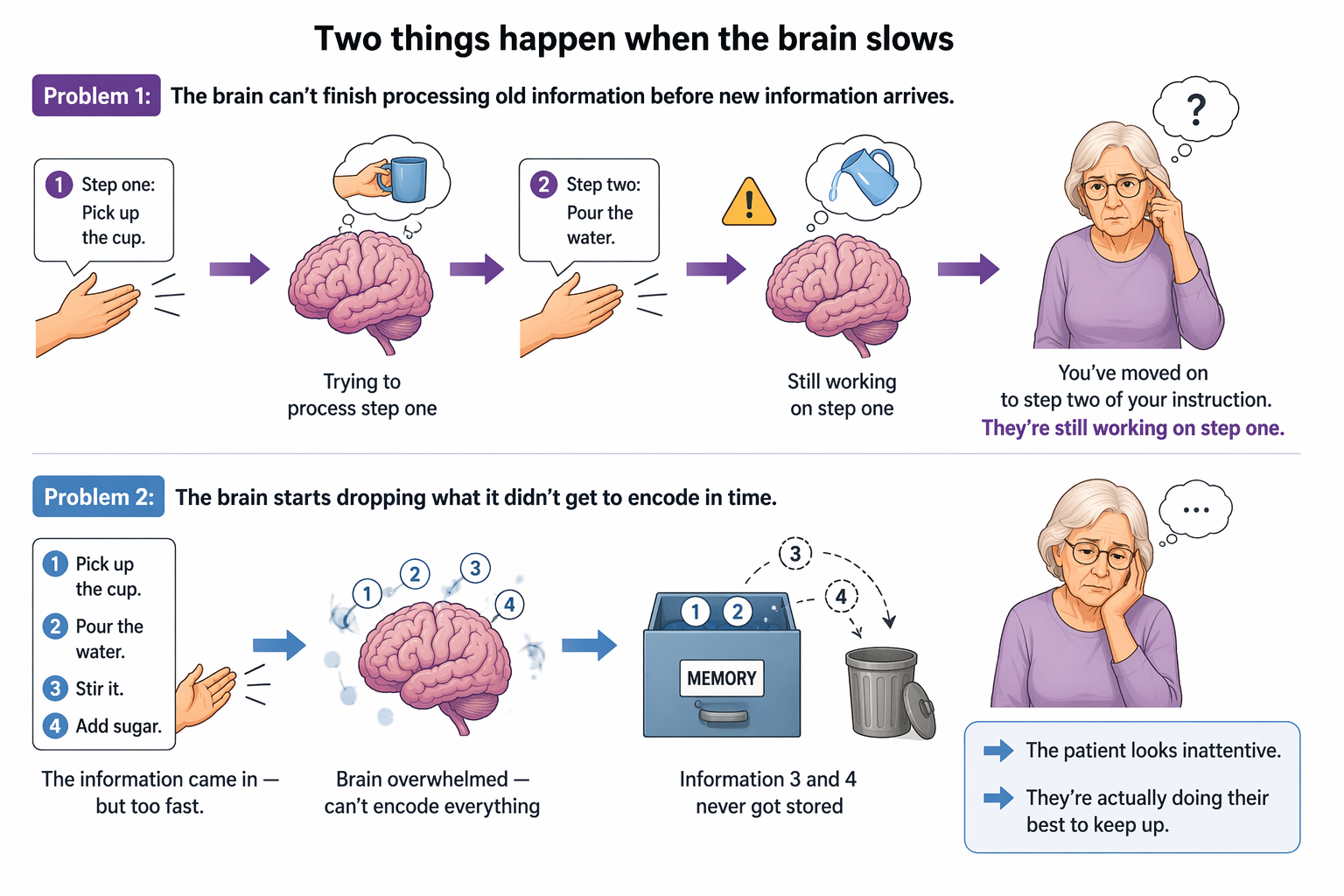 Margaret is a 72-year-old in outpatient PT after a fall. She's alert, pleasant, scores 27/30 on her MoCA. But her PT notices she takes 5–6 seconds to respond to verbal cues during gait training — and when those cues come quickly in a busy hallway, she stops walking entirely. Her OT sees the same thing during meal prep: she can complete each step, but needs extra time between them before she can move on. Margaret isn't unsafe because she's weak. Her brain needs more time between incoming information and outgoing action.