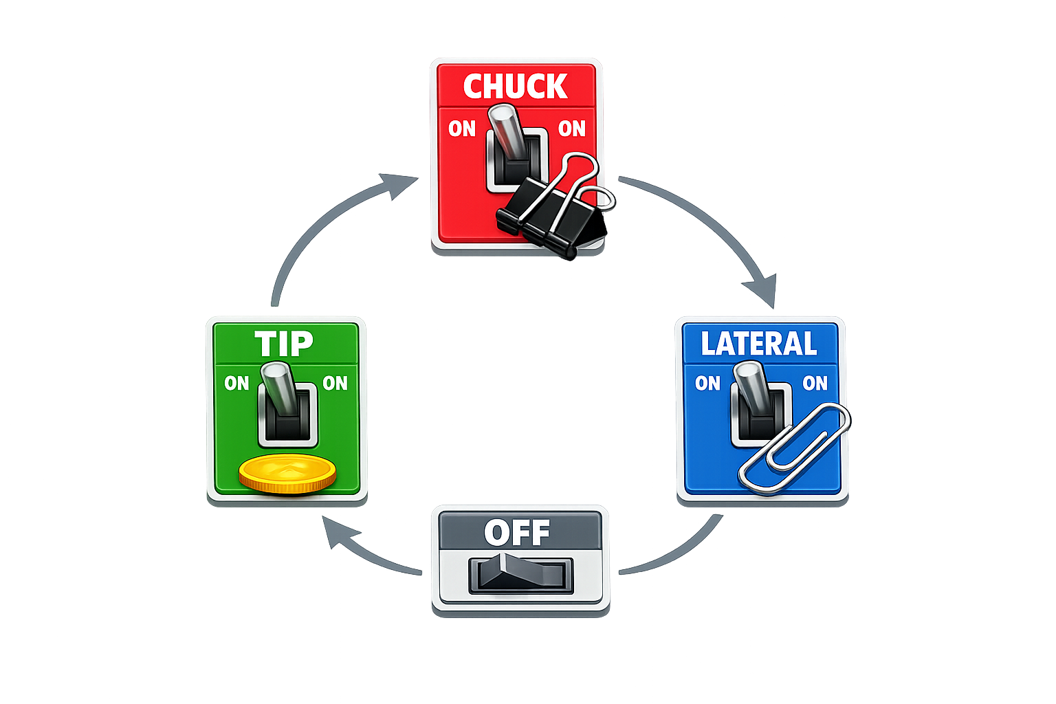 Tip pinch to pick up the coin. Chuck pinch to grip the binder clip. Lateral pinch to manipulate it open. Back to tip pinch to place it.